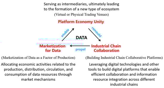 Data marketization has significantly accelerated the growth of platform economies, reshaping supply chain collaboration. This, in turn, facilitates the empowerment of entities through data, allows for optimal data allocation, and further promotes marketization [40] (Figure 1).
