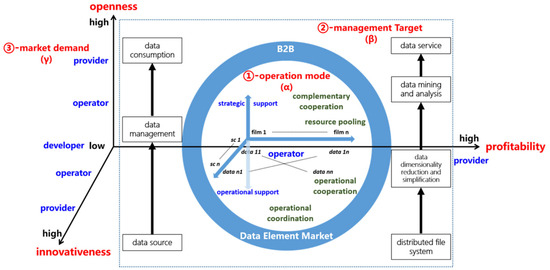 Building on the governance principles of joint construction, joint governance, and shared ownership [50,51], we further refine the operational framework. The B2B operational mode [52] evolves into a three-dimensional model of data revenue operations (Figure 3), which models the data revenue distribution to delineate how data providers, platform operators, and developers—under four distinct digital platform models—leverage three key dimensions (i.e., operational models, management objectives, and market demands) to select optimal data service strategies across the nodes of the data industrial chain (e.g., from data sourcing to data management and finally to data consumption), thereby maximizing their respective benefits. This approach is designed to achieve openness [53], innovation [54], and profitability [47] and aligns with the structural industrial chain to unify B2B operational modes with the allocation of data property. It serves to clarify the multi-level dynamic ownership mechanisms of data subjects, thus establishing a robust B2B data property allocation system.