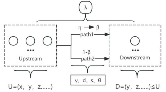 Focusing on a single industry chain of B2B data as the research object, the data trading process (depicted in Figure 4) involves the upstream industry generating datasets (U) that are transmitted through two distinct channels. A proportion (P1) of sensitive data is transmitted via Channel 1 to the downstream industry, requiring additional investment into encryption and protection efforts. In contrast, a proportion (P2) of non-sensitive data is transmitted via Channel 2, which does not require such protections. Ultimately, the downstream industry receives a dataset Dd that is a subset of the upstream data Du.