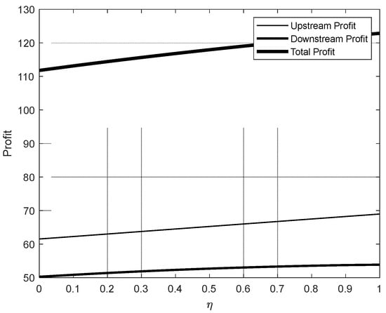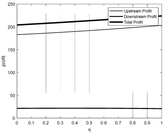 According to (3)–(5), we obtain the optimal reaction function sums for the downstream industry as and . Then, we substitute these into and obtain