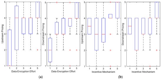 Boxplot analysis. (a) Impact of data encryption protection efforts on upstream and downstream pricing; (b) Impact of the incentive mechanism coefficient on upstream and downstream pricing.