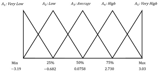 The maximum and minimum values of the standardized winning percentages are −3.19 and 3.03, respectively. Therefore, the fuzzy partition for the interval [−3.19, 3.03] is as follows.