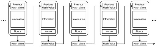 Blockchain is a type of cryptographic technology and has been proposed as a decentralized system [12,13,14]. The blockchain mechanism is shown in Figure 1. Here, we describe a Proof-of-Work algorithm. The blockchain works by incorporating the hash value of the past block. When adding the next block, the nonce value must be adjusted to ensure that the hash value of the entire block meets certain conditions.