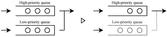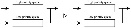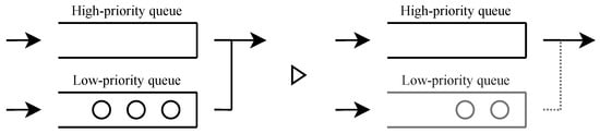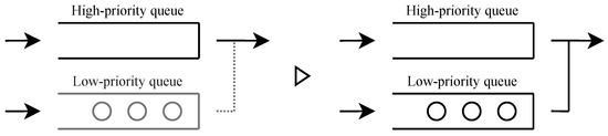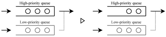 The service follows an exponential distribution. Therefore, according to Poisson arrivals (see time averages [30]), the certain probability, p, where the high-priority queue is zero and the server state is that all users are served when the service is performed is equivalent to the steady state probability, . The stability condition of the low-priority queue can be expressed as (16) using the effective service rate. Note that is the traffic density in the low-priority queue.