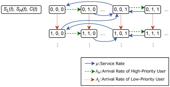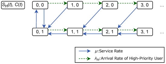 Second, we consider the stability conditions for the low-priority queue. The low-priority users are approved only when the high-priority queue is zero and the server state is such that all users are served, as shown in Figure 7. Therefore, the effective service rate of the low-priority queue can be expressed as , where p is the probability that the high-priority queue is zero and the server state is that all users are served.