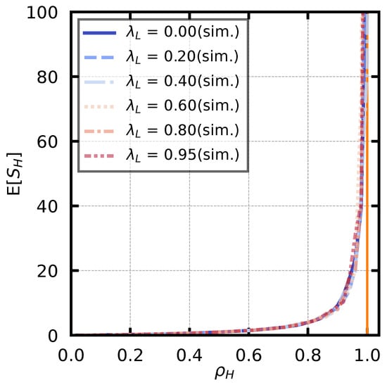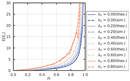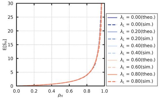 First, we verify to derive stability conditions for low-priority queues. The theoretical value of is given by (15). In addition, simulations are performed under the same condition as in Figure 8. The service rate is fixed at . We derive the arrival rate of the high-priority users based on (2) such that takes a value from to in steps of . Theoretical and simulated values are shown in Figure 10. From the figure, it can be seen that the theoretical values and simulation values generally agree.