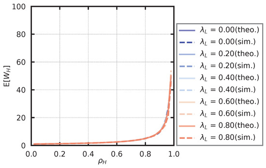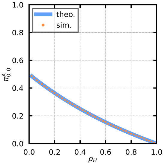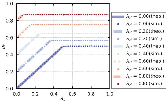 In deriving the theoretical solution, the upper limit of the size of the high-priority queue, K, is set at 200. The repeated calculations of are stopped at n when the maximum value of the elements of is less than . The service rate is fixed at , and the arrival rate of high-priority users is set as . In addition, the arrival rate of the low-priority users, , is set from to in steps of . For each parameter set, we calculate the probability that only high-priority users can be approved, . The theoretical and simulated results are shown in Figure 12. Note that locations where does not satisfy the stability condition of the low-priority queue are not listed because there is no theoretical value.