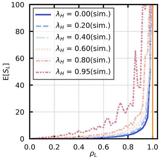 Second, we examine the stability conditions of the low-priority queue. The theoretical value is given by (16). In addition, a simulation is performed under the same condition as in Figure 6. The service rate is fixed at , and the arrival rate of high-priority users is set as . We derive the arrival rate of the low-priority user based on (16) such that takes a value from to in steps of . For each parameter set, we derive the average number of customers of the low-priority customer, . The simulation results are shown in Figure 11. Note that an auxiliary line is drawn at , which is the boundary of the stability condition. The figure shows that increases exponentially as approaches 1, and diverges when is greater than or equal to 1.