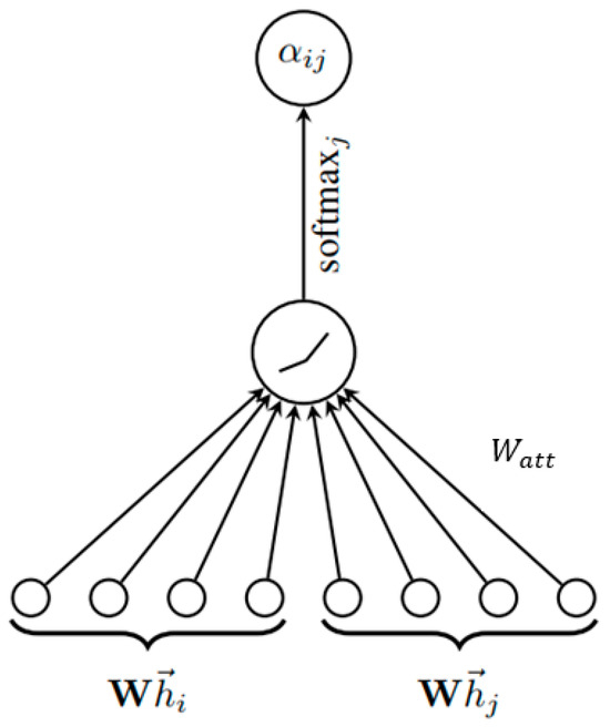 The attention coefficient indicates the importance of features of node for node . In its most general formulation, the model allows each node to attend to every other node, discarding all structural information. The graph structure is introduced into the mechanism by performing masked attention. That is, are calculated only for nodes , where is some neighborhood of node in the graph. It means the first-order neighbors of node (including ). In order for the coefficients to be easily comparable for different nodes, they are normalized for all variants of using the function (3):