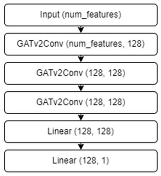 The proposed system is based on graph neural network (GNN) technology. The GAT attention mechanism with three GATv2Conv convolutional layers was used as the graph neural network architecture (Figure 3).