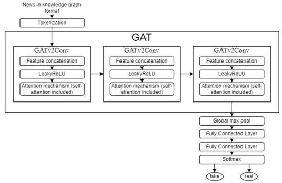 Graph attention networks (GATs) are one of the most powerful types of graph neural networks [26]. They have wide applicability due to a number of reasons. In regular graph convolutional networks (GCNs), all neighboring nodes have the same importance, which is not always the right approach since each node can have its own unique significance and influence the outcome of the network. Because in the context of fake news detection, users and information sources often vary significantly in terms of their influence and credibility. To solve this problem, graph networks with attention mechanisms (GATs) have been developed. They take into account the importance of each neighboring node by assigning a weight to each connection. Thereby, the network can more accurately determine which nodes to consider when performing a task. This enables the model to prioritize the most influential users and information sources during prediction, enhancing both accuracy and robustness. Furthermore, GAT’s ability to dynamically adjust these weights makes it particularly well-suited for the rapidly changing landscape of fake news, where new users and sources continuously emerge.