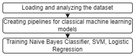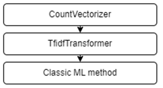 In the process of evaluation of the models based on classical machine learning methods, a pipeline was constructed that implements a sequence of stages of data transformation (Figure 10). This is necessary due to the fact that in order to work with text in natural language, the data must be represented in a numerical form perceived by the models.