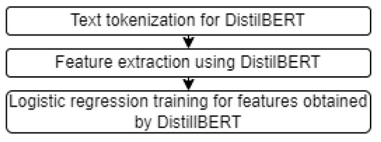 Next, the DistilBERT language model was evaluated (Figure 11). DistilBERT is based on the idea of distillation [45]. DistilBERT language model optimizes the training process by reducing the size and increasing the speed of BERT while maintaining up to 97% performance.