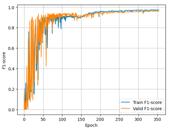 The data were split into training, validation, and test sets. To prevent overfitting, the early stop was implemented that interrupts a training cycle if the value of the error function on the validation set does not decrease within 10 epochs. The best model is preserved through serialization. The training was carried out using the Google Colab platform on GPU. Graphs of the dependence of the value of the error function and F1-score on the epoch number are presented in Figure 8 and Figure 9, respectively.