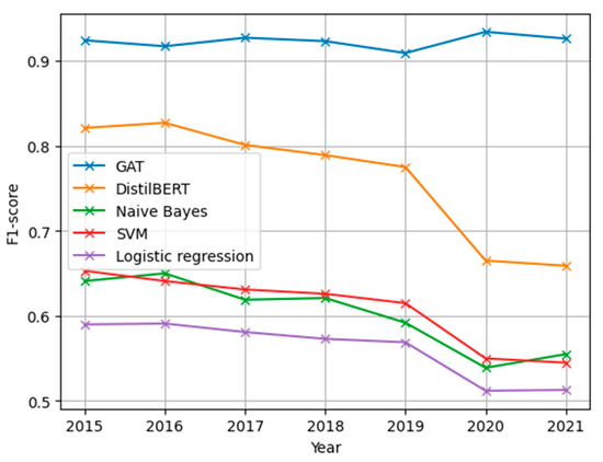 Additionally, a study was conducted to analyze the changes in model performance over time. The proposed model, which is based on the GAT architecture, was compared with classical machine learning models and the DistilBERT language model. These models were trained only on data from the dataset obtained before the end of 2015. Next, F1-score values were calculated for test data from subsequent years after 2015 (Figure 12).
