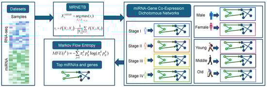 In this study, we used RNA-seq data, miRNA data, and methylation data from TCGA-COAD in the Xena database—a colon cancer program within the TCGA program. The detailed distribution of the samples is referenced in Section 2.1. Specific data were constructed for the different clinical subgroups, including different disease stages (Normal and Stage I–Stage IV), gender (male, female), and age (<50, 50–70, 70+), specific miRNA–gene co-expression networks were constructed for each category, and the network was constructed using the information–theoretic method of maximum relevance and minimum redundancy (MRNETB), which is a combination of maximum correlation and minimum redundancy. MRNETB, the specific steps refer to Section 2.2 []. Furthermore, the Markov flow entropy (MFE) is calculated separately for each network to measure node importance; the calculation process of MFE and its significance are detailed in Section 2.3. The entire workflow is shown in Figure 1.