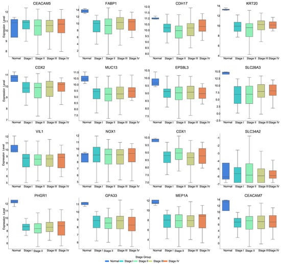 As can be seen in Figure 2, most of the genes are expressed at lower levels in the tumor stage compared to normal tissue. Genes such as CDX2, FABP1, KRT20, CDH17, MUC13, EPS8L3, SLC26A, VIL1, CDX1, PHGR1, GPA33, MEP1A, and CEACAM7 show lower expression in the “Stage I–Stage IV” stages compared to the “Normal” stage. Genes such as CEACAM5, CDH17, KRT20, MUC13, PHGR1, and GPA33 show significant downregulation in Stage II. CDH17 demonstrates a decrease in expression from “Normal” to Stage II, followed by an increase from Stage II to Stage IV, with the lowest expression observed at Stage II. CDX2 shows an increase in expression at Stage IV. SLC26A3 progressively increases its expression level as the disease advances. CDX1 exhibits an “N-shaped” expression pattern from Stage I to Stage IV. SLC34A2 shows an increase in expression from normal tissue to tumor stages. GPA33 shows a decrease in expression from Stage III to Stage IV, while MEP1A shows an increase in expression from Stage III to Stage IV. This suggests that these genes may be closely associated with the onset and progression of COAD, and their expression changes significantly as the disease advances, potentially playing crucial roles in tumor formation and progression.