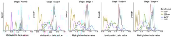Distribution of methylation beta values of CDH17, CDX2, CEACAM5, EPS8L3, KRT20, and MUC13 at different clinical stages. It can be seen that these genes are similarly methylated in both normal and tumor samples, with CDH17 and EPS8L3 mainly distributed at 0.6–0.7, which is in a hypermethylated state, and the other genes mainly distributed below 0.6.