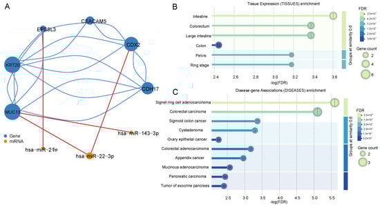 We identified the intersection of the top ten genes and miRNAs ranked by MFE values across different stages, indicating their potential importance at all stages. Since the co-expression network was constructed based on expression data, the actual functional roles of these genes and miRNAs remain unclear. Therefore, we constructed a functional interaction network for the core genes and miRNAs using the STRING database for protein–protein interactions and the miRTarBase database for miRNA–target interactions, as shown in Figure 5A [,]. The blue nodes represent genes, and the orange nodes represent miRNAs. We found that these genes form a connected network in their actual regulatory roles, revealing that KRT20 had the highest degree of connectivity, indicating its central role in the gene cluster. Additionally, hsa-miR-22-3p was found to regulate two key genes, CDX2 and MUC13, suggesting its importance in the regulatory network.