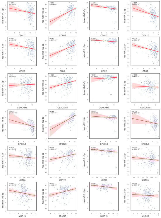 In our investigation of gene–miRNA expression relationships, as shown in Figure 6, we observed that hsa-miR-143-3p exhibits no significant correlation with CEACAM5 and KRT20 expression, but shows a negative correlation with other genes in the network, suggesting a potential inhibitory regulatory mechanism. In contrast, hsa-miR-192-5p demonstrates a positive correlation with the expression of CDH17, CDX2, CEACAM5, EPS8L3, KRT20, and MUC13, indicating a possible role in promoting their expression. Notably, hsa-miR-21-5p displays weak correlations with all studied genes, implying minimal involvement in their regulation under the current conditions. Furthermore, hsa-miR-22-3p exhibits a strong negative correlation with CDH17 and CDX2, and a weaker negative correlation with other genes, highlighting differential regulatory strengths across the network. These findings provide critical insights into gene regulatory networks and their implications in disease mechanisms.