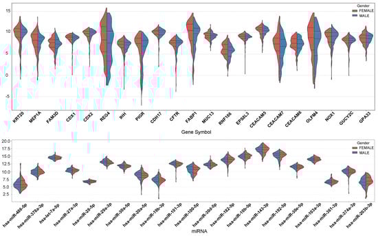 In Figure 7, we present the expression profiles of the top 10 genes with the highest MFE values in both males and females, as well as the top 10 genes with the highest MFE value differences between males and females. The overall expression levels of MEP1A, REG4, IHH, PIGR, FABP1, RNF186, CEACAM7, and OLFM4 were lower in males than in females. On the other hand, the expression levels of hsa-miR-27a-3p, hsa-miR-29a-3p, hsa-miR-101-3p, and hsa-miR-100-5p were slightly higher in males than in females. Conversely, hsa-miR-378a-3p, hsa-miR-192-5p, and hsa-miR-203b-3p exhibited higher expression in females.