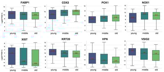 Boxplots of expression values of different genes in three age groups. FABP1, XIST, KRT20, HPN, and VSIG2 decreased in expression with age, in contrast to CDX2, PCK1, and NOX1, which increased in expression with age.