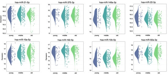 Violin plots of expression values for different miRNAs in three age groups and sample distribution. The expression of hsa-miR-375-3p and hsa-miR-22-3p decreased with age; on the contrary, the expression of hsa-miR-148a-3p, hsa-miR-192-5p, and hsa-miR-10b-5p increased with age.