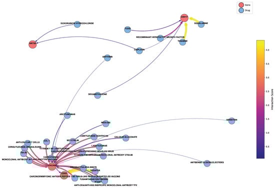 Based on the genes in the core network in Section 3.2, we extracted the drugs associated with these genes from the DGIdb database to map the network, as shown in Figure 10 []. It is not difficult to summarize the key targeted drugs, as specifically shown in Table 6. The table presents several potential therapeutic drugs for colon cancer. The potential of these drugs as colon cancer treatments is closely associated with their unique molecular mechanisms.