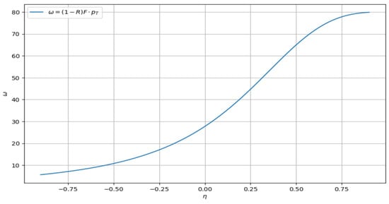 Assuming an initial asset value , a drift rate , and a volatility , the face value of the corporate bonds is set at , with a maturity time , a risk-free interest rate , default threshold , and recovery rate . The interarrival times of the renewal process are assumed to follow a log-normal distribution characterized by a mean and a volatility . The accompanying figure depicts the variation in the CDS premium ω as it relates to the parameter η.
