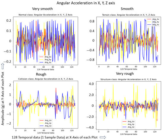 Numerous terrain floors with different textures, roughnesses, and imperfections are studied for effective terrain-induced vibration or roughness level classification and also for the acquisition of vibration data for each class. Accordingly, a total of 36 indoor floor environments are selected for training data acquisition, which include typical floors built using materials of different roughnesses (concrete, marble, different textured tiles, vinyl, carpet, small pebble paving, etc.), as well as typical floor objects and imperfections (power cable routing and junction boxes, various tactile pavements, gaps or misalignment due to poor workmanship, damaged or broken floors, etc.), and we segregate them based on the roughness level and vibration amplitude level into four classes—very smooth, smooth, rough, and very rough—as shown in Figure 3. Depending on the roughness, floor features, or imperfections, the robot vibrates at different amplitudes. A higher system degradation rate is expected when exposed to the very rough class. As terrain-induced vibrations affect the linear and angular motion of a mobile robot, we use the onboard Vectornav VN-100 IMU sensor to record the linear acceleration (X, Y, and Z-axis) and angular velocity (roll, pitch, and yaw) based on the accelerometer and gyroscope of the IMU sensor, respectively. The data acquisition algorithm also calculates the angular acceleration in three axes from the current and previous angular velocity measured for each instance to strengthen the dataset for better training accuracy. Hence, nine sensor data are collected as vibration data for each class by exposing the robot to the aforementioned varied terrain environments. We set the same operating speed for the robot, 0.08 m/s, during the data acquisition stage. The IMU data subscription rate is set at 100 Hz and we group each sensor datum (process window size) into 128 elements. Hence, each dataset is modeled as [128 × 9]. Here, compared to the previous IMU-based work [16], a faster subscription rate is set, without affecting the prediction accuracy, as only terrain-induced vibration is studied in this work. Hence, a faster real-time prediction rate is achieved, i.e., a prediction every 1.28 s based on the process window size of 128. A time–amplitude graph is plotted for a single time step (128 temporal data), showing the distinct vibration signal variations across the four roughness level classes, as shown in Figure 4. One of the data features, angular acceleration, is only shown for visualization purposes. Finally, the data are compiled into a 3-dimensional input array [n × 128 × 9] (number of samples, time step, and the nine sensor data features) and we label the respective classes as input data for the 1D CNN-based model’s training.