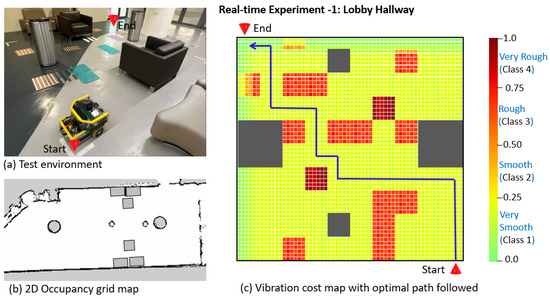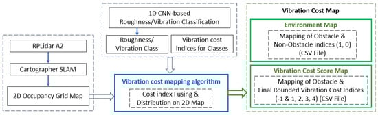 - An algorithm is formulated to fuse the vibration cost, assigned to each vibration class predicted for every footprint of the robot, and a 2D occupancy grid map of the robot’s workspace, and we develop a vibration cost map. This map contains profiles of obstacles, the roughness score of the workspace at a unit area, and the robot’s pose for navigation.