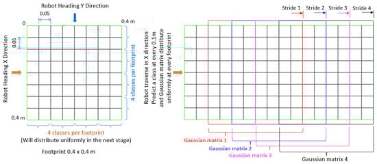 First, a grid-based 2D occupancy map is generated for the robot’s deployment area using the onboard 2D LiDAR scanner and the Cartographer SLAM (Simultaneous Localization and Mapping) algorithm [65]. This environmental map shows the obstacle profile, i.e., the obstacles and the robot-traversable area. Next, based on the 1D CNN-based vibration class prediction algorithm, the robot scans the whole workspace to assess the vibration/roughness level of the given area. As the robot vibrates as a whole system, the robot’s footprint 0.4 × 0.4 m is taken as the unit area of vibration. The robot predicts a roughness class approximately at every 0.1 m of travel, as per the parameters set, such as the robot speed (0.08 m/s), IMU subscription rate (100 Hz), and data process window (128). Hence, there are four roughness class predictions at every footprint, which will be distributed uniformly, so that each footprint area represents a particular vibration class. The robot operating system (ROS) 2D environment map has a resolution of 0.05 × 0.05 pixels; hence, the footprint area is divided into 8 × 8 cells, i.e., each cell in the footprint is equivalent to the ROS pixel size. Based on the roughness classes predicted, cost index threshold values of 0.25, 0.50, 0.75, and 1.0 are assigned to the classes very smooth, smooth, rough, and very rough, respectively. Further, a vibration cost mapping algorithm is developed, which assigns a threshold cost index value for every roughness class predicted and fuses them at the particular unit area of the 2D SLAM map in parallel. Based on the robot’s direction, a new vibration class will be predicted, and the cost index is fused at every two columns (8 × 2) or rows (2 × 8) for the X and Y directions, respectively. However, these direction changes impact the final vibration cost map less as they are uniformly distributed at every footprint. As every new cost index is fused per th of the footprint, the cost index values will be normalized at a scale of 0 to 1 for uniform distribution. This is achieved by using a sliding window (size 8 × 8) Gaussian matrix for each predicted cost index while the robot moves. The footprint details, with the cell representation, the prediction of the classes at every stride, and the Gaussian matrix during the robot’s travel in the X direction, are represented in Figure 7. A color code scale is applied based on the normalized cost index value and we generate a vibration-aware cost map for visual representation. The cost mapping algorithm generates two CSV files as output. The first is an environment map, showing the obstacle area with an index of 1 and the non-obstacle or traversable area with 0 for the given 2D occupancy grid map. This environment map also represents the robot’s pose for navigation and localization. Secondly, a final vibration cost score is produced at every footprint based on the rounded cost value for every footprint, which is a cost score of 1, 2, 3, or 4 for the very smooth, smooth, rough, and very rough vibration classes, respectively, and all obstacles are represented as -1. Hence, this final vibration cost map contains all of the information, i.e., the obstacle profile, the vibration cost score at every footprint, and the robot’s pose.