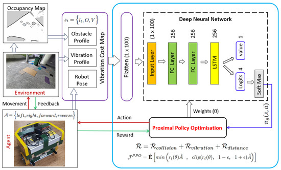 A deep reinforcement learning (DRL) network is modeled in Figure 8. This is used to execute PPO for the fine-tuning and stabilization of the policy. The action probability () and inference value are estimated by developing a deep neural network, which consists of an input and two output layers. The neural network input consists of three pieces of information: the obstacle details from the occupancy map generated by the 2D LiDAR, the roughness/vibration class areas of the environment predicted by the 1D CNN classification model, and the robot’s position for navigation. These input details, embedded in the vibration cost map of the () matrix, are flattened to () before feeding them to the network. The neural network is structured using three hidden layers: two fully connected (FC) layers followed by a Long Short-Term Memory (LSTM) layer. The data shape of each layer is kept as (). A activation function [67] is used in this network to activate the neurons in all stages. In the two output layers, the first head is used for the inferred value observed from the environment, and the rest are used for logits representing every action. These raw outputs from the logits are converted to probability distributions using a softmax layer. Here, Equation (7) is used as a loss function while training the network model, and the weights () are updated to maximize the objective function . Further, the optimum action from the distribution is rolled out to the robot’s action, i.e., the robot’s movements to the target area. Algorithm 1 shows the pseudocode for PPO execution, as explained in [58].