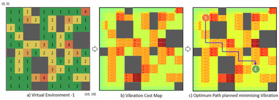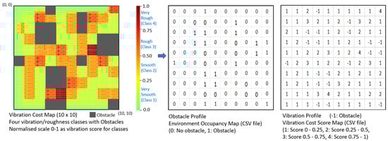 A virtual vibration cost map and the corresponding environment occupancy grid and real-time vibration cost scores are developed to evaluate the vibration cost mapping algorithm, as shown in Figure 9. A virtual floor area of 4 × 4 m is selected and randomly assigned obstacles and different vibration classes. As the robot’s footprint is 0.4 × 0.4 m, it is equivalent to 10 × 10 footprints. Four roughness classes are predicted and fused at every footprint, which are uniformly distributed, generating an effective vibration or roughness class per footprint. Here, the robot’s travel is directed by starting from position (0, 0), moving along the Y axis in a zig-zag pattern, to complete the roughness class prediction, vibration cost mapping, and uniform distribution. Two CSV files are generated as the output of this vibration cost mapping. An environment occupancy grid map shows the obstacle area and non-obstacle area, i.e., a static environment map. This is mainly for navigation and the avoidance of obstacles. The second CSV file, for the latest vibration cost score mapping, shows the undesired terrain roughness levels for the given workspace. This dynamic map is updated based on the 1D CNN-based real-time terrain prediction of the roughness classes. These two CSV files are the inputs for the RL agent for optimum path planning. The vibration cost map also represents the robot’s location, mentioning the X and Y coordinates in the map. This vibration cost map helps to visualize the given environment’s roughness level distribution, which fosters the selection of operational modes, maintenance, and rental strategies for professional service providers.