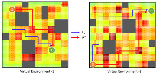 In order to compare our model with the current path planning (A*) method, a performance index is formulated as per Equation (9). The A*-based path planning was developed based on obstacles and a short distance to the destination only, whereas, in the proposed RL-based system, the roughness levels of the terrain are also equally considered for path planning. Here, the movement parameter represents the model’s efficiency in finding the shortest path and counts the total number of movements triggered, and each movement has a footprint length of 0.4 m. The roughness score is the sum of the roughness index assigned earlier for each class, i.e., 1 to 4 for the very smooth to very rough classes. A higher roughness score indicates high maintenance costs and operational risks. We tested the above two virtual environments with the A* algorithm, comparing it with the proposed RL vibration-aware path planning model in terms of obtaining a short path and eliminating the vibration-prone rough areas, i.e., obtaining a low roughness score. There could be some scenarios in which, to avoid the rough area, the robot has to choose a longer path, which is not recommended because it equally affects the robot’s health due to prolonged operation. Hence, the ideal performance index (PI) is set as ≥ 1 to optimize the consideration of both the total movements and roughness score. The optimum paths chosen by these two algorithms (A* and RL) for the two virtual environments are illustrated in Figure 12. Accordingly, the performance indices for the Virtual 1 and 2 environments were 1.22 and 1.36, respectively. Here, the RL-based model could find the shortest path, as with A* (total movements), i.e., Virtual 1—12 moves and Virtual 2—17 moves. The total roughness scores for Virtual 1 were 22 and 18 for A* and RL, respectively. Similarly, for Virtual 2, they were 34 and 25 for A* and RL, respectively. Hence, the proposed vibration-aware RL-based path planning framework enables a path that minimizes the traversal through extremely rough areas, safeguarding the robot’s health and operations (see Table 3).