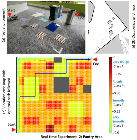 First, the 2D occupancy grid map was generated for both environments, using the onboard RP LiDAR scanner and Cartographer SLAM algorithm, as shown in Figure 13b and Figure 14b, generating the obstacle profiles. Further, using the inference engine algorithm, the roughness classes of both environments were predicted by covering the whole 4 m × 4 m area in a zig-zag pattern. The robot’s linear speed was set at 0.08 m/s, and the IMU subscription rate was 100 Hz, as per the vibration cost mapping algorithm. Hence, a new roughness class was predicted at every 0.1 m, and the roughness levels were distributed per footprint as per the vibration cost mapping framework, as explained in the previous section, generating the vibration profile. Finally, the robot’s start and end point coordinates were assigned, generating the vibration cost map as input to the RL-based network. The PPO rollout generated a path, minimizing the traversal through the vibration prone-area and calculating the shortest path, as marked on the vibration cost map in Figure 13c and Figure 14c for Experiments 1 and 2, respectively.