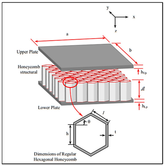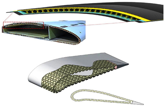 In recent years, the demand for modeling and analysis of enhanced mechanical structures has significantly increased in various mechanical engineering applications [1,2]. Materials with a high strength-to-weight ratio, which are utilized in sandwich structures, have become increasingly prevalent due to their superior mechanical properties, including high stiffness, strength, and fatigue resistance [3,4,5,6]. One of the most promising designs in this category is the honeycomb sandwich panel, which consists of two stiff face sheets separated by a low-density core. The unique combination of properties allows honeycomb structures to excel in applications that require optimized weight reduction without compromising structural integrity. Furthermore, these structures, traditionally used for their load-bearing capacity, are now being explored for multifunctional uses. As highlighted by previous studies [7,8], sandwich structures with a honeycomb core have been widely used in aerospace application due to their excellent properties. Figure 1 illustrates the titanium Kagome core solution proposed by Ullah et al., which outperforms traditional honeycomb cores in terms of shear strength and compression. Such innovative cores, including Kagome, folded, and corrugated designs, provide enhanced structural integrity and offer viable alternatives to commonly used Nomex or aluminum honeycombs, particularly for applications like ailerons [9,10,11].