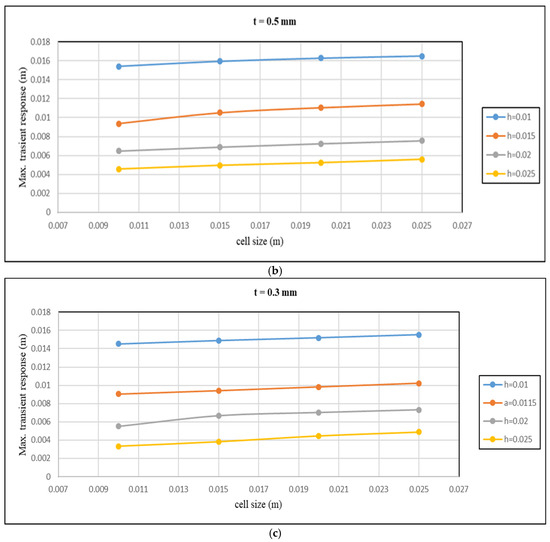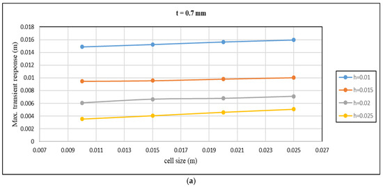 Figure 7 illustrates the use of ANSYS 19.2 software to simulate the forced vibration of the honeycomb sandwich under a transient load. We separately meshed the skins and core, then assembled the entire honeycomb plate model. The FEM models consist of 105,384 elements and 107,500 nodes for the honeycomb sandwich plate. The meshing process was carried out using Solid 168 elements, which are well suited for dynamic vibration analysis due to their ability to accurately capture bending and deformation effects in three-dimensional structures. To ensure numerical accuracy, a mesh refinement strategy was applied, with finer elements in high-stress regions. Furthermore, a mesh convergence study was conducted to verify that the results remained stable and independent of further mesh refinement. The simulation of the finite element model supported the boundary condition for all edges, where all edges were constrained to prevent translational displacement (Ux = 0, Uy = 0) while allowing rotational degrees of freedom. The mesh process showed a satisfactory convergence of the results and provided confidence in finite element modeling. The modal analysis was performed implicitly to obtain the natural frequency, and the results were transformed into the transient response analysis. The simulation took a total of 0.025 s, divided into 11 steps, each with a time step of 0.00004 s. A time step sensitivity analysis was conducted to evaluate the impact of Δt on the transient response and maximum transient response (maximum deflection). The results confirmed that reducing the time step further had a negligible effect, validating the choice of Δt = 0.00004 s as a balanced selection between accuracy and computational efficiency.