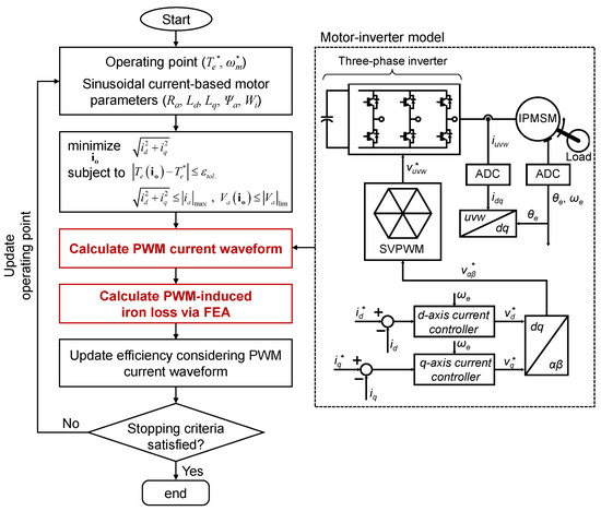 Process for calculating efficiency map of IPMSM considering PWM-induced iron loss.