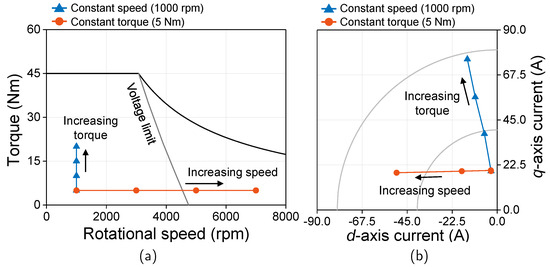 In order to analyze the effect of PWM-induced iron loss, the efficiency of the example IPMSM was analyzed using electromagnetic FEA according to the increases in torque at a constant rotational speed and the increase in rotational speed at constant torque, respectively, as shown in Figure 2a. As the current vector control is performed, the trajectory of the current vector is shown in Figure 2b. When the rotational speed is constant at 2000 rpm, the armature current increases proportionally as the torque increases. On the other hand, as the rotational speed increases at constant torque, the armature current increases, and the current phase angle increases for flux-weakening control.