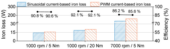 Figure 3 shows the iron loss and efficiency depending on whether the PWM current is considered according to the electromagnetic torque and rotational speed, respectively. It can be seen that the sinusoidal current-based iron loss and PWM current-based iron loss differ in magnitude due to the PWM-induced iron loss, but they have similar trends for current vector and rotational speed. When the rotational speed increases at constant torque, the iron loss increases as the fundamental frequency of magnetic flux density increases. In addition, the differences in iron loss and efficiency are large depending on the PWM current because of the PWM-induced iron loss. On the other hand, the increase in iron loss as the torque increases is small because the magnetic loading is larger than that of the armature loading in IPMSM. Therefore, the PWM current should be considered to accurately calculate efficiency at the design stage, as the traction motor is mainly operated at high speed rather than high torque.