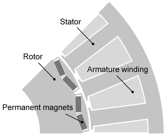 Interior permanent magnet synchronous motors (IPMSMs) are widely used in the automotive industry because of their suitable characteristics for the high-speed trend in electric powertrains (e-powertrain) and their strong field-weakening characteristics due to a high saliency rotor structure [1,2]. As the era of electric vehicles (EVs) arrives, the mileage of EVs is being used as a major indicator to determine their competitiveness [3]. The e-powertrain consists of a battery, inverter, converter, traction motor, and reducer. Each component serves to convert and transfer the electrical energy stored in the battery into mechanical energy [3]. During the energy conversion, electromagnetic and mechanical energy losses occurs in the e-powertrain [4]. Therefore, the improvement of mileage can be categorized in two ways. The first way is to improve the energy density of the battery or enhance the capacity of the battery [5,6]. Since the energy stored in the battery is the same as the fuel of an ICE, the mileage can be improved by increasing the energy density or quantity of the battery. However, there is a limitation because it leads to increase in the weight and price of EVs. Therefore, it is more efficient to use the other method, which is to improve the efficiency of the e-powertrain for enhancing the mileage of EVs [7,8].