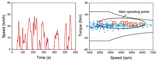 The detailed design requirements for the traction motor are listed in Table 1. In order to design the high power density traction motor, the rotor topology was selected as V-type with 16 poles and 24 slots, as shown in Figure 4. Since the traction motor is used for personal mobility, the maximum output power is set to 14.5 kW, and the New York City Cycle (NYCC), which is widely used for light-duty vehicles to simulate low-speed urban driving, is used to calculate the energy consumption. The design parameters and their design space are listed in Table 2. The geometry of the traction motor has 8 degrees of freedom (DOF), and global optimization is performed to maximize the overall efficiency through the NYCC drive cycle while minimizing the torque ripple and total harmonic distortion (THD) of the induced voltage. The operating points of the NYCC are compressed into 9 representative operating points, as shown in Figure 5, and weights are set according to the operating frequency. The overall efficiency can be calculated as