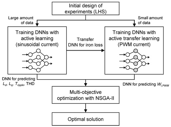 where and are the total iron loss and iron loss density per n-th element and m-th harmonic, respectively; and are magnetic flux density and frequency, respectively; and is the volume of the n-th element. All of the performances are analyzed with sinusoidal current, and the DNNs can be trained by using the acquired sinusoidal current-based data with active learning. Therefore, the sinusoidal current-based performances can be predicted by using the trained DNNs, except for iron loss. As the iron loss is affected by PWM current, a DNN for iron loss is additionally trained using the proposed active transfer learning to consider the effect of PWM current. The detailed training process for sinusoidal and PWM current-based performances is described in the next subsection. Then, the multi-objective optimization (MOO) is conducted for designing the traction motor with the NSGA-II algorithm [27]. In order to calculate the overall efficiency, current vector control is conducted for each design point using the predicted sinusoidal current-based d and q-axis inductance, flux linkage, and PWM current-based iron loss. Finally, the optimal solution can be derived by setting the weight of the objective functions of overall efficiency, torque ripple, and THD of induced voltage to 6:2:2.