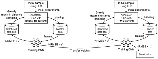 Figure 7 shows the overall process for training the sinusoidal and PWM current-based motor performance using active transfer learning. The proposed method trains the surrogate model by combining two key methods: active learning and transfer learning. The DNNs for predicting the sinusoidal current-based performance are trained using active learning, and then the DNN for predicting the PWM-induced iron loss is trained using active transfer learning with a small amount of dataset.