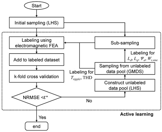 As we discussed in Section 2, it is necessary to consider the PWM current in the design of the traction motor, but the FEA with a small time step is required for calculating the harmonic magnetic flux density near the PWM frequency band, and it results in an increase in computation cost. In order to reduce the computation cost for efficient optimization, the active transfer learning-based surrogate modeling for PWM iron loss is proposed in this section. In addition, the design process of the traction motor using the proposed method is discussed.