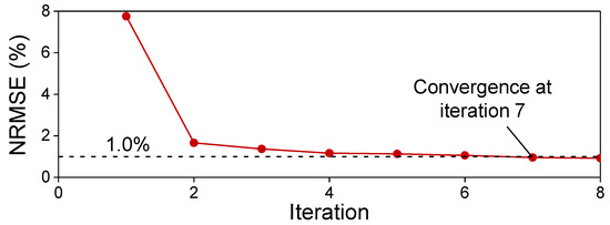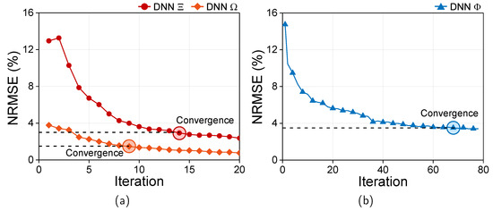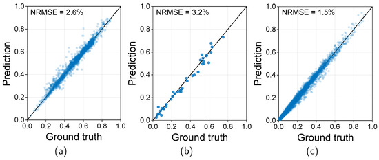 Figure 9a,b shows the results of active learning with GMDS for each DNN. It can be seen that the number of required samples to reach the target NRMSE is different because the data distribution varies according to the labels, and the number of derived data per each iteration differs according to the types of labels. The number of required datasets for DNNs , , and are 9800, 1400, and 56,700, respectively. In the case of torque ripple and THD, many iterations were required as sub-sampling was not performed. As can be seen in the results, it is possible to minimize the annotation process to achieve target performance by using active learning with GMDS. Figure 10a–c shows the regression performance of DNNs , , and . Each DNN was trained using all labeled data derived from active learning, and the test dataset was acquired by annotating an additional 20 samples using GMDS. As a result of performing active learning, it can be seen that the NRMSE for all DNNs is within the target performance.