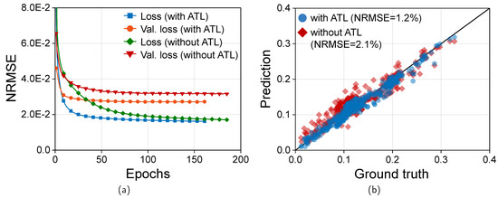 Comparison of training performance between DNN with or without using active transfer leraning: (a) learning curve and (b) regression performance.
