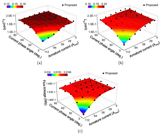 Comparison of simulated and predicted motor parameters: (a) d-axis inductance, (b) q-axis inductance, and (c) flux-linkage.