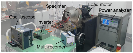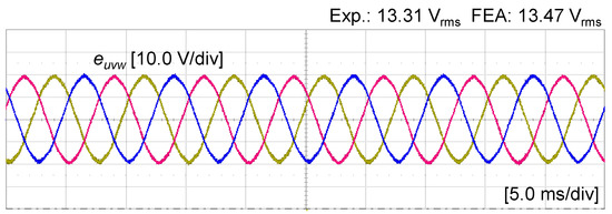 Figure 14 shows the experimental setup with the fabricated motor. In order to verify the performance of the magnetic circuit for the fabricated motor and the efficiency accounting for the PWM-induced iron loss, a dynamometer with measuring equipment is necessary. Therefore, a dynamometer and inverter were used to control the specimen with various output powers. The dynamometer consists of a load motor with Siemens 1PH8087-1SN00-0LA1 and Kistler 4503B, allowing it to operate up to 15 kW and 200 Nm. The Unidrive M700 of Control Techniques was used as an inverter to drive the fabricated motor, and the maximum current is 70 Arms. The GP20 of Yokogawa was used as a multi-recorder for monitoring the temperature variation of the windings. In addition, a power meter of Yokogawa WT1800 was used for measuring the input and output power of the fabricated motor, and an oscilloscope was used to measure the waveform of the phase current and line-to-line voltage. Figure 15 shows the comparison between the simulated and measured waveforms of the phase back-EMF at 1000 rpm at room temperature. Since the difference in the back-EMF between the simulated and test results was 1.2%, the specimen was properly fabricated according to the design result.